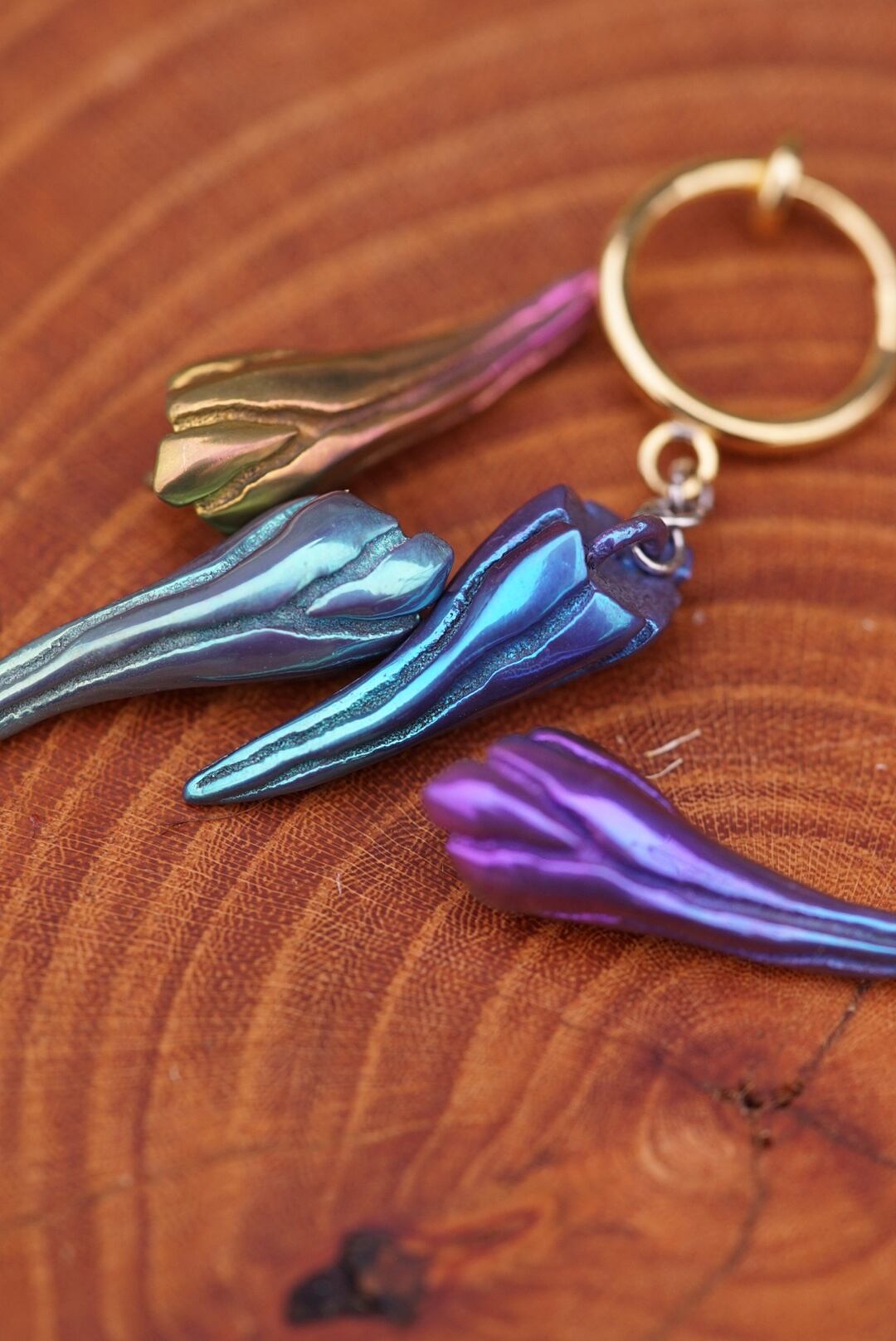 チタンの陽極酸化という技術で色の膜を発生させ、シャボン玉・虹・モルフォ蝶と同じ構造色を作りあげています!