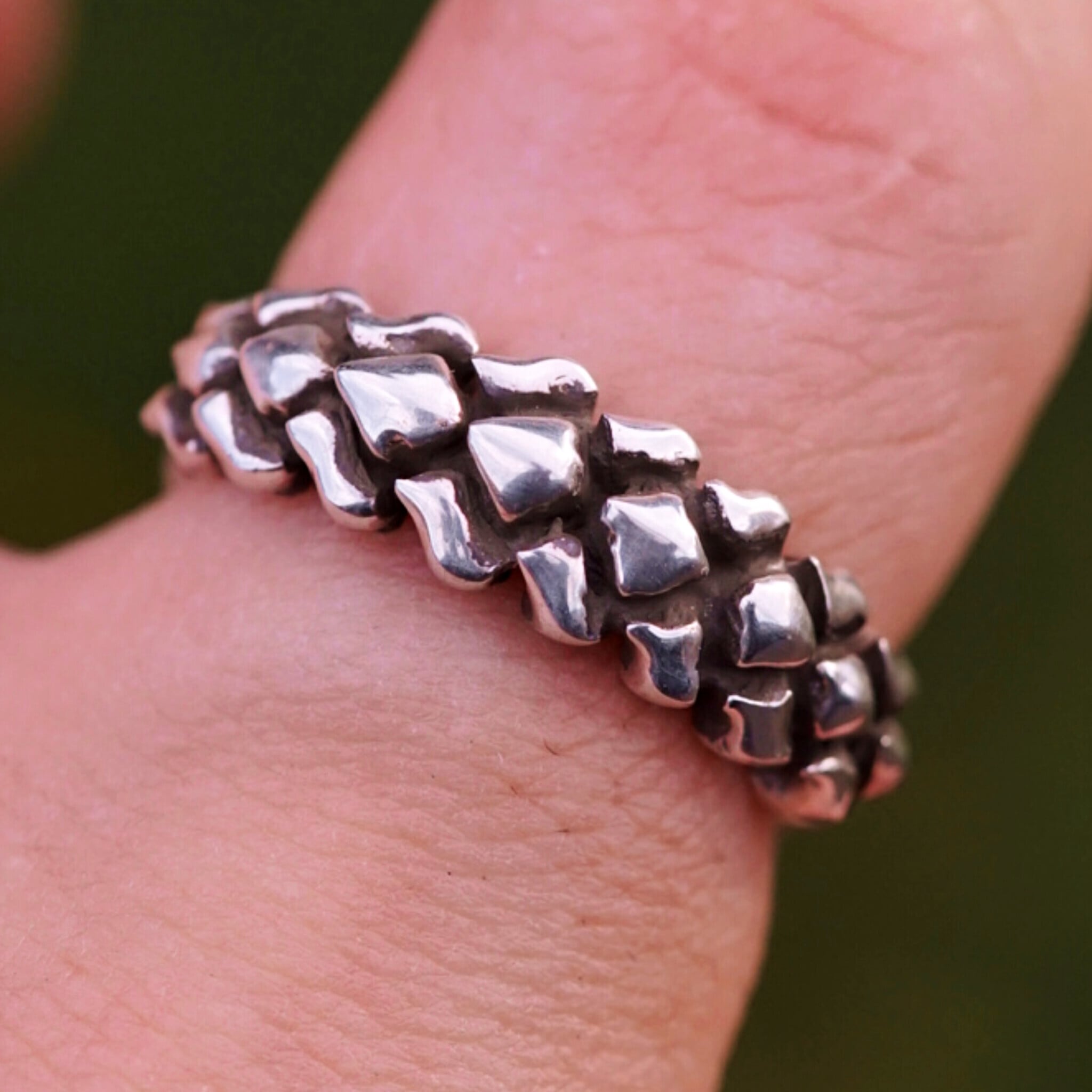 燻しによる漆黒な溝とピカピカな鱗の表面で、立体感と厚みのある逆鱗表現