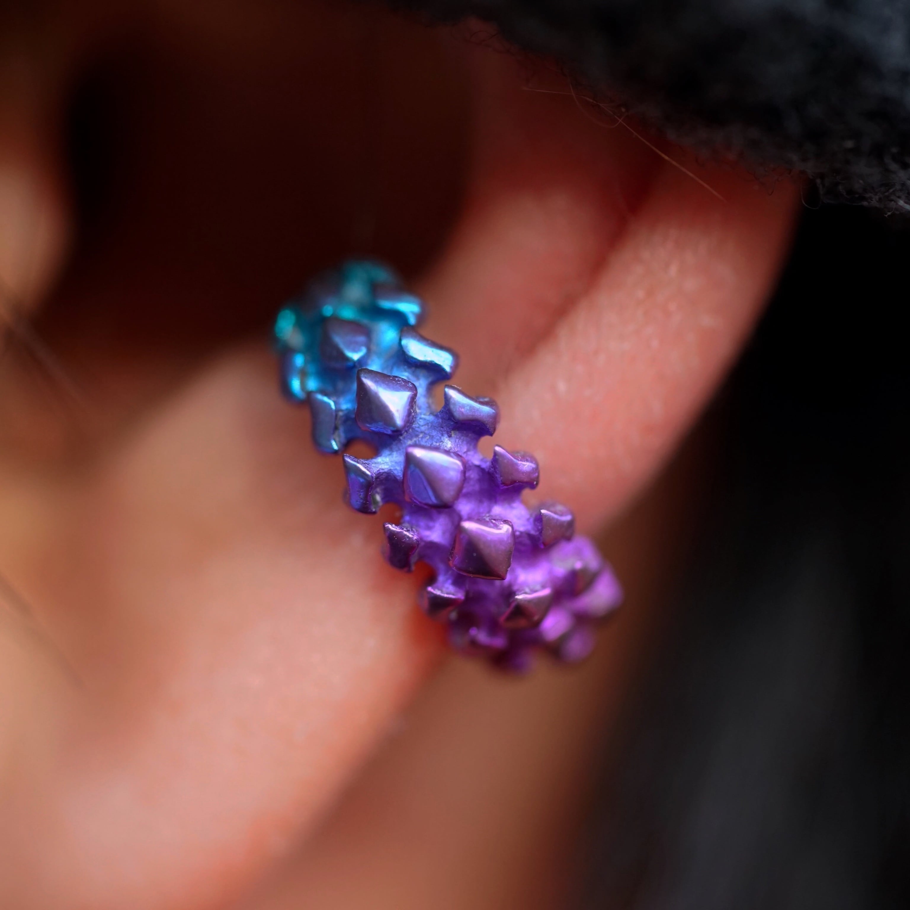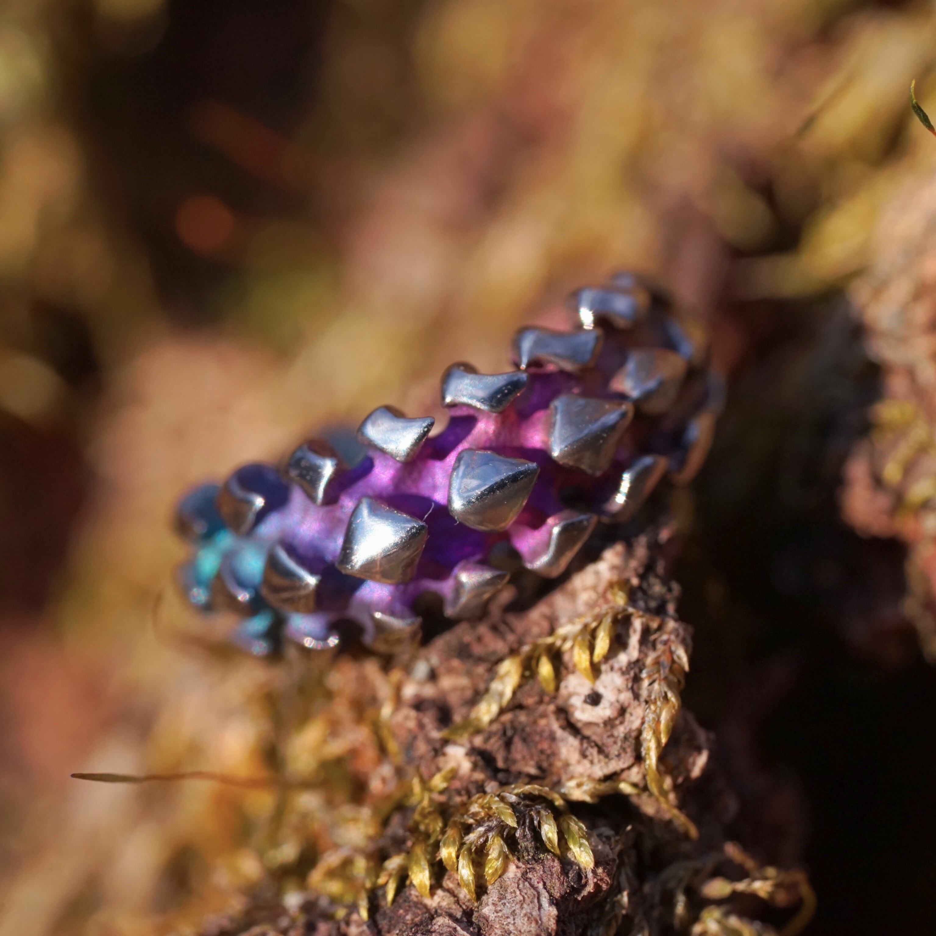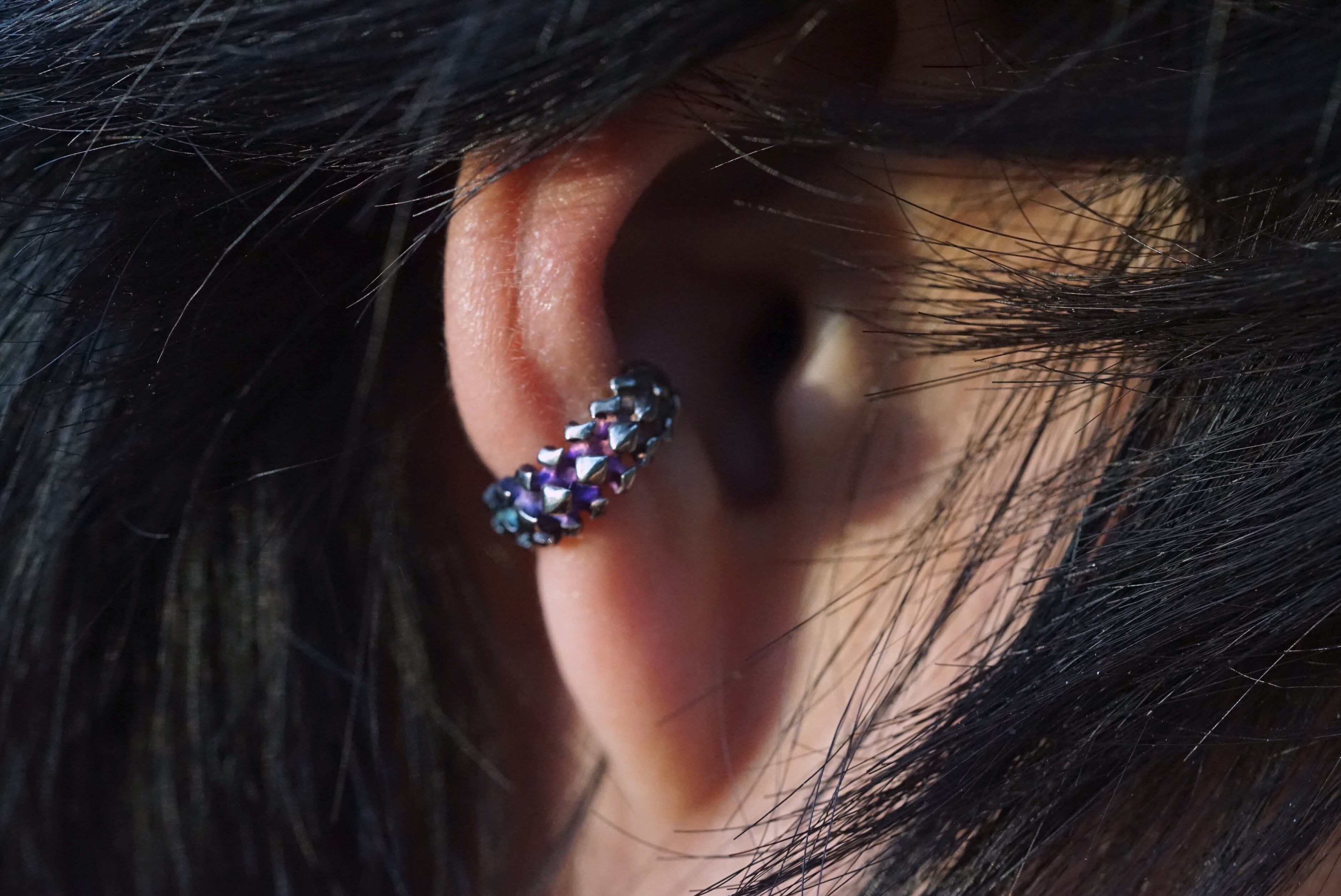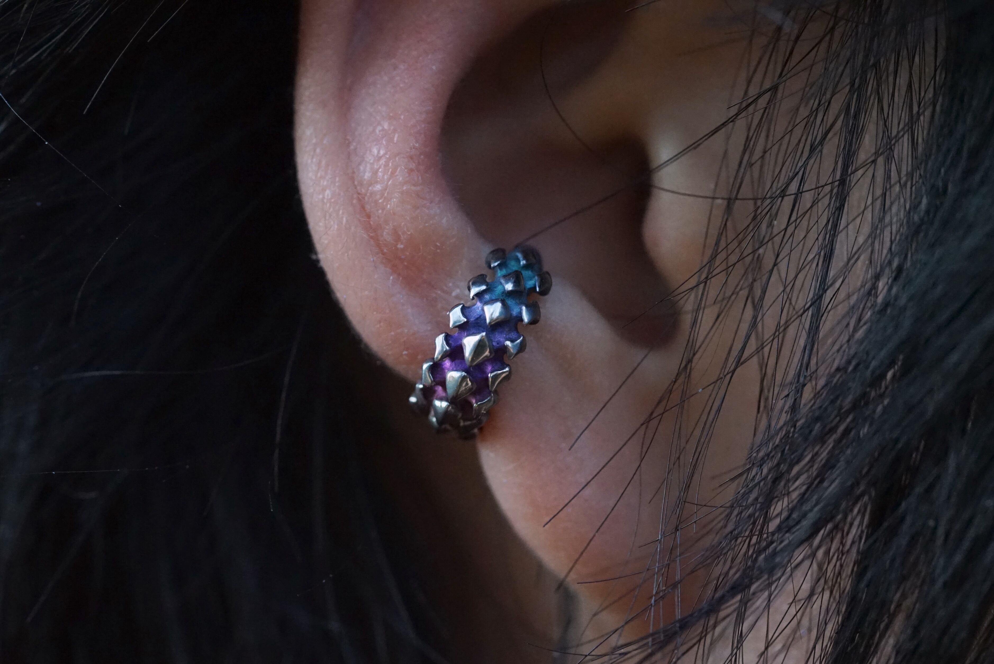 チタンでお好きな色・仕上げをセレクトできるので、左右で色を変えたり様々なカスタマイズができます!グラデーションにすると装着向きを上下反転させ、気分で見える色や鱗の流れを変えることも可能です。
